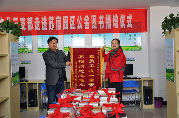 活動(dòng)現(xiàn)場(chǎng),陳彤彤代表蘇大教服集團(tuán)黨委物業(yè)三支部捐贈(zèng)了《紅樓夢(mèng)》、《中國(guó)文學(xué)》、《管理學(xué)》等書籍20余種310冊(cè)和羽毛球拍、乒乓球拍等文體用品;張?bào)K代表建發(fā)公司向蘇大教服集團(tuán)黨委物業(yè)三支部贈(zèng)送了題為“黨員工友一家親,蘇宿兩地心連心”的錦旗,以示感謝。