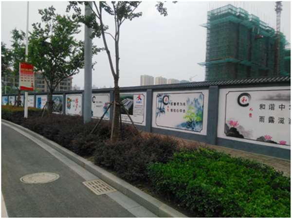 目前,現(xiàn)場各項(xiàng)安全文明設(shè)施正在緊鑼密鼓的建設(shè)中,其中臨時圍墻不僅是工地對外展示的第一形象,也是企業(yè)宣傳、安全宣傳、方案公示等信息的展示平臺。項(xiàng)目部通過人工手繪結(jié)合局部噴繪的方式既宣傳了創(chuàng)文、創(chuàng)衛(wèi)、核心價值觀的標(biāo)語,又營造了“青磚綠瓦”的江南韻味。為園區(qū)的創(chuàng)文建設(shè)增添了新的亮點(diǎn)。