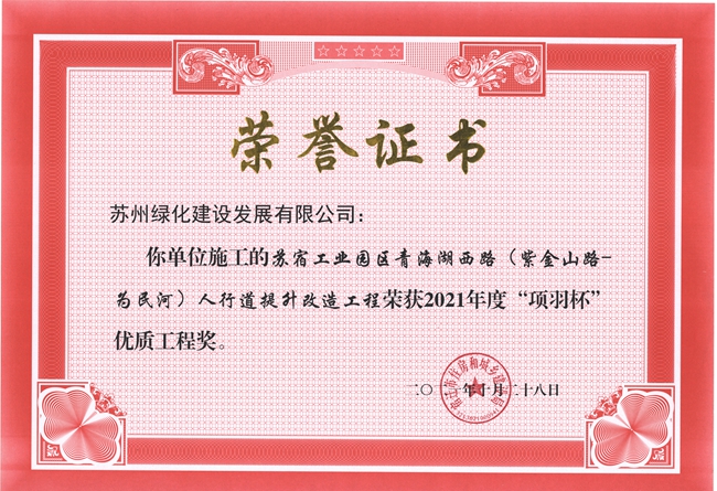 近日,蘇宿工業(yè)園區(qū)青海湖西路(紫金山路-為民河)人行道提升改造工程被宿遷市住房和城鄉(xiāng)建設局授予“項羽杯”優(yōu)質工程獎。