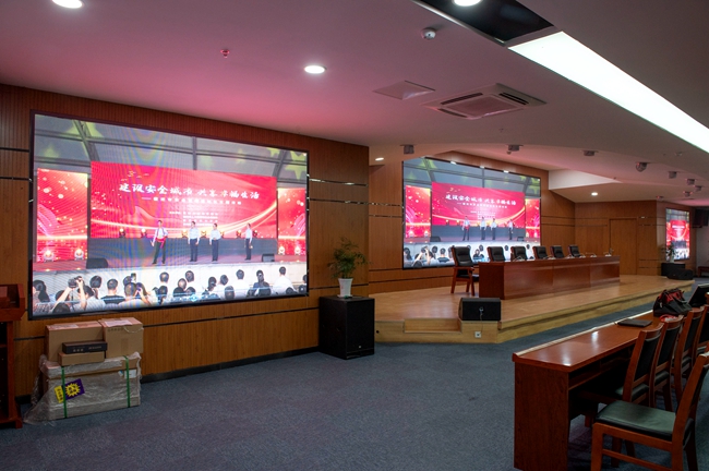 經(jīng)過改造,安全教育館新增3塊LED屏幕,其中主席臺處主LED顯示屏面積約20平方,東西兩側(cè)輔助LED顯示屏各約6平方。LED屏幕采用顯示單元像素間距為P2-2.5,具有顯示面積大、分辨率高、超高對比度、超寬視角、無縫拼接、維護方便等優(yōu)點。改造后進(jìn)一步提升了視頻會議效果,增加了會場多功能性。
