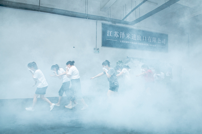企業(yè)員工在搜救人員的指揮帶領(lǐng)下,彎著腰,貓著步,捂住口鼻,沿著指定路線(xiàn)有序撤離到一樓的安全地帶。