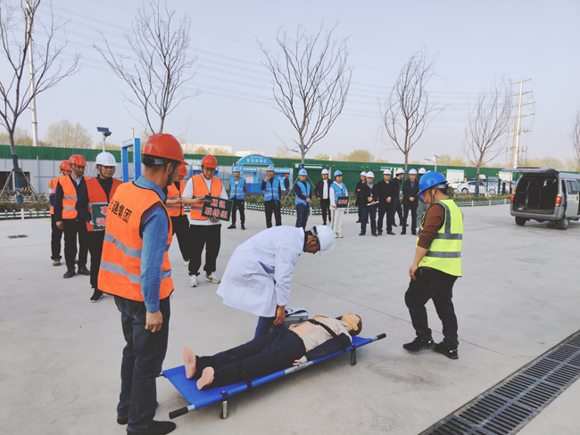 本次演練共分6個小組,分別為:現(xiàn)場模擬組、現(xiàn)場警戒(搶修)組、應(yīng)急救援(疏散)組、通訊聯(lián)絡(luò)組、事故調(diào)查組、 觀摩組。假設(shè)工人在生活區(qū)違規(guī)使用大功率電器突發(fā)火災(zāi),被煙霧和火勢圍困,二樓有人發(fā)出救援信號,正在附近巡查的安全員發(fā)現(xiàn)情況后,立即趕赴現(xiàn)場并打電話給項目生產(chǎn)負責人,在接到通知后,項目生產(chǎn)負責人迅速安排項目部應(yīng)急救援辦公室負責人,并啟動應(yīng)急預(yù)案,各救援小組立即到達現(xiàn)場開展工作,安全員迅速引導(dǎo)全體人員有序從疏散樓梯疏散到安全位置,救援組帶著擔架、急救箱等趕赴現(xiàn)場,將“受傷”人員用擔架從房內(nèi)撤離到安全位置,同時救援醫(yī)生對“受傷”人員進行簡單的心肺復(fù)蘇、人工呼吸,并迅速送往醫(yī)院進行治療。