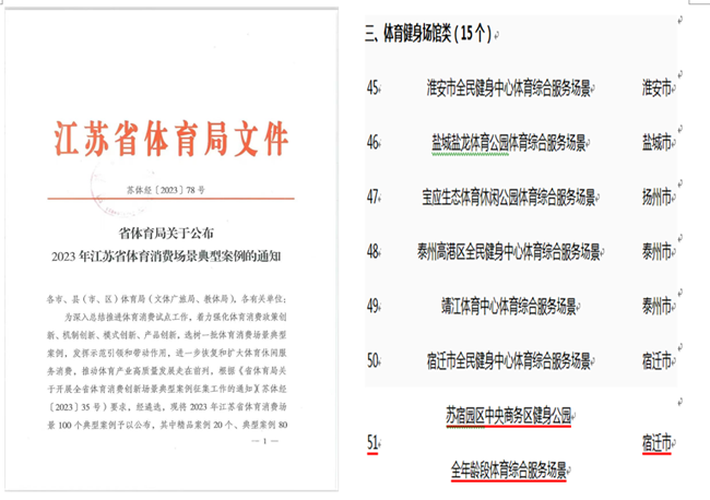 近日,江蘇省體育局印發(fā)《關(guān)于公布2023年江蘇省體育消費(fèi)場景典型案例的通知》,遴選公布100個(gè)體育消費(fèi)場景典型案例,其中精品案例20個(gè)、典型案例80個(gè)。蘇宿園區(qū)中央商務(wù)區(qū)健身公園全年齡段體育綜合服務(wù)場景入選2023年江蘇省體育消費(fèi)場景典型案例。