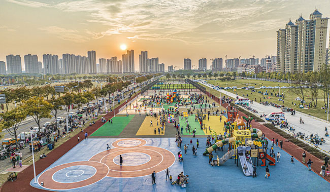 玄武湖西路北側(cè)臨時(shí)健身公園占地面積約2.2萬平方米,內(nèi)部設(shè)置720米健身跑道、全齡段健身區(qū)、綜合兒童活動(dòng)區(qū)、平地輪滑場、廣場舞區(qū)及各類球場(籠式籃球場4組、7人制籠式足球場1組、羽毛球場4組、網(wǎng)球場一組)等6項(xiàng)主題運(yùn)動(dòng)功能,滿足周邊群眾“一站式”運(yùn)動(dòng)健身需求。場地建成后先后登上人民日報(bào)頭版、新華日報(bào)、學(xué)習(xí)強(qiáng)國等國家主流媒體,園區(qū)充分利用閑置待開發(fā)地塊空間,積極構(gòu)建“10分鐘健身圈”,獲得周邊居民的認(rèn)可和喜愛。