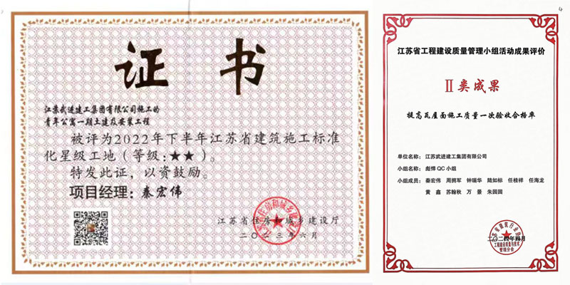 項目在施工中先后獲得了江蘇省建筑施工標準化星級工地、江蘇省綠色施工示范工程、宿遷市工程質(zhì)量管理小組活動II類成果、江蘇省工程建設(shè)質(zhì)量管理小組活動成果評價II類成果等榮譽,同時受到了主管部門、業(yè)界同行的充分肯定。