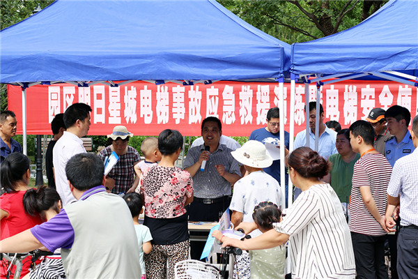 8月6日上午,園區(qū)市場監(jiān)管局、社工委在明日星城小區(qū)組織電梯事故應急救援演練暨電梯安全使用宣傳進社區(qū)活動。