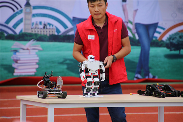 表演中,兩臺多軸飛機在場地作繞場及8字飛行,在飛行4分鐘后,隨著背景的高潮音樂響起,在空中打開了橫幅——“共創(chuàng)文明社區(qū),締造幸福家園?!彪S后,無論是機器人的介紹演示、固定翼無人機的拉煙表演還是直升機表演,又或是像真機空中格斗飛行,都讓同學們在互動和操作中充分感受到了科技的飛速發(fā)展,拓展了視野,更對航空模型制作產(chǎn)生了濃厚的興趣。