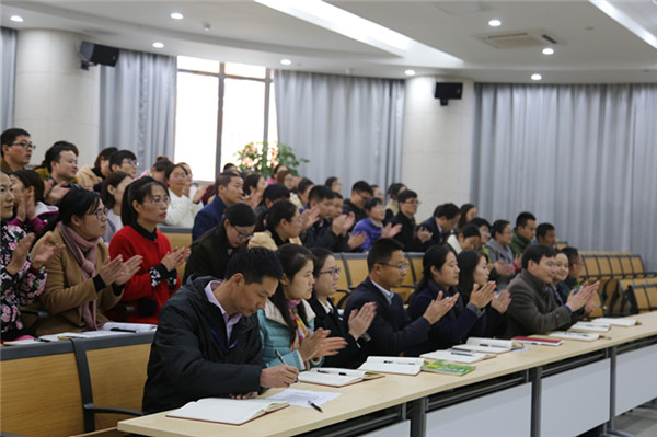 駱敏從“做教師的意義、如何成為學(xué)生心目中的好老師和如何成為大家心中的好老師”三個(gè)方面給老師們上了一堂別開生面的專業(yè)發(fā)展課。駱敏指出,教師應(yīng)該具有高尚奉獻(xiàn)、完善自我的意識(shí),特別要從細(xì)節(jié)方面、從學(xué)生的角度思考,開啟通向優(yōu)秀教師的通道。駱敏認(rèn)為學(xué)生心目中的好老師應(yīng)該是一名演說家、幽默大師,具有獨(dú)特的教學(xué)藝術(shù),對(duì)孩子能夠真誠贊美、懂得尊重學(xué)生、真心關(guān)愛學(xué)生。作為好老師,應(yīng)該修德、修志、修學(xué)、修能、修性,有欣賞的眼光,感恩的心態(tài)。